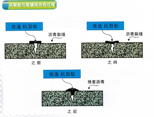 在面層下裂縫處(或伸縮縫)鋪設(shè)道路抗裂貼,形成一個(gè)應(yīng)力吸收層和一條防水密封帶,從而加強(qiáng)了道路的抗拉、抗剪切強(qiáng)度,基本消除水對(duì)公路的危害,防止了裂縫的擴(kuò)張、反射到面層,減少后期養(yǎng)護(hù)費(fèi)用,延長(zhǎng)道路使用壽命。